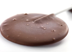 Air bubbles: these can appear as gaps or air pockets in the surface of your chocolate. This can occur if your chocolate is over-tempered and the chocolate thickens up, preventing the escape of air bubbles. Bubbles are often also present if your moulds have been insufficiently vibrated or shaken – shaking your moulds helps to remove air bubbles from the chocolate.