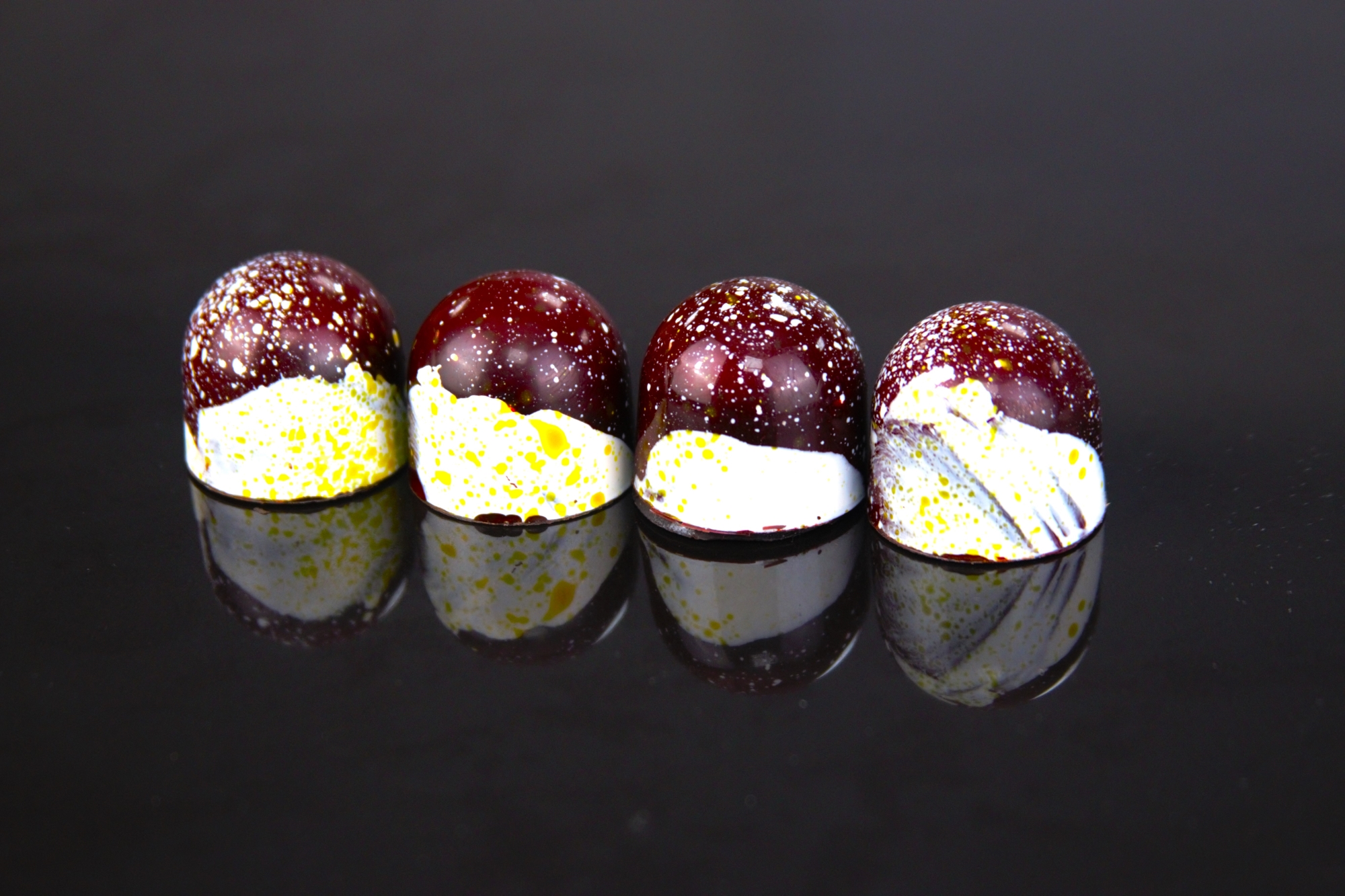 - Allow the splatters to set before spraying each mould with red cocoa butter