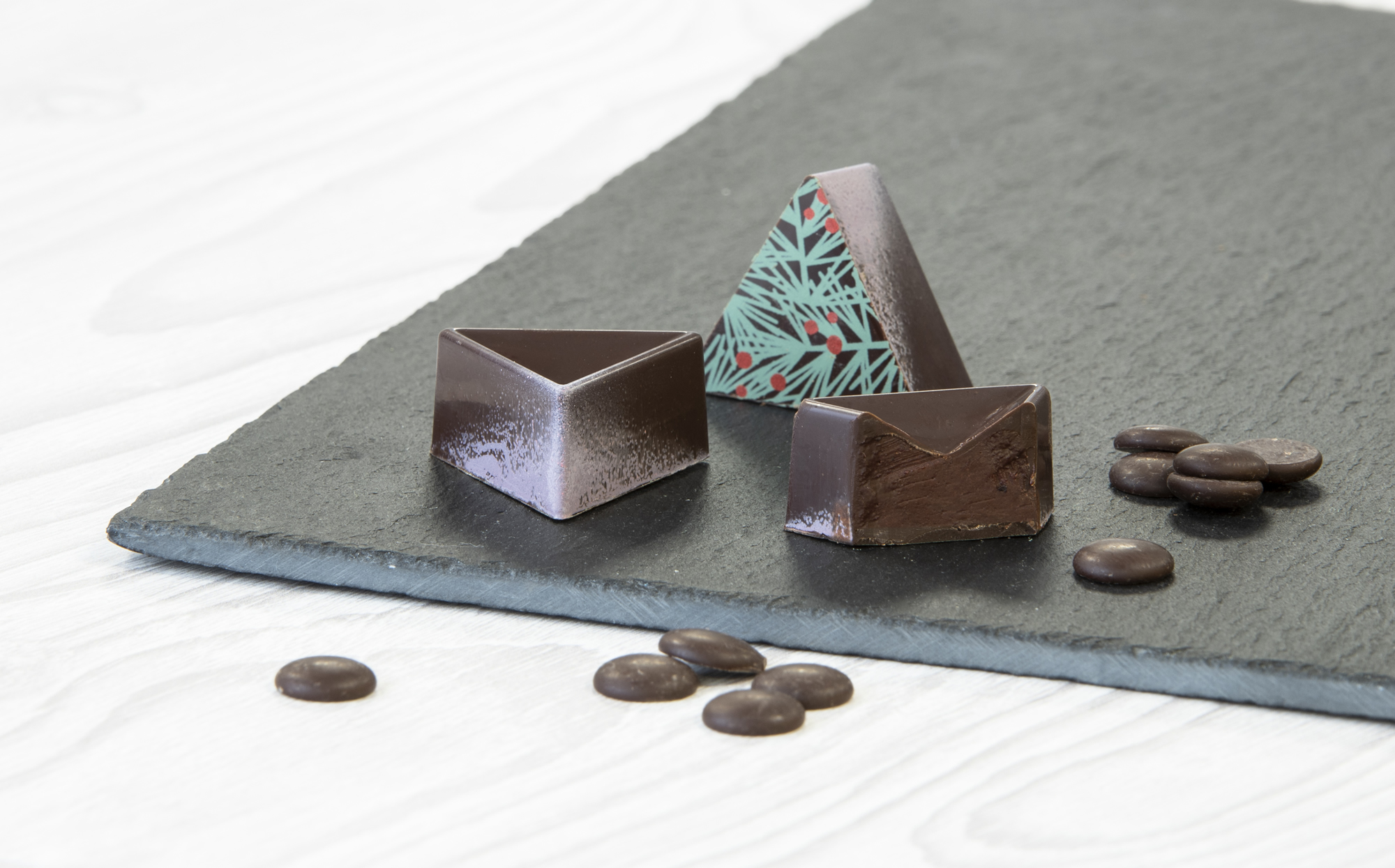 4. Cap the chocolates with Veliche Okapi Chocolate and using a transfer sheet.