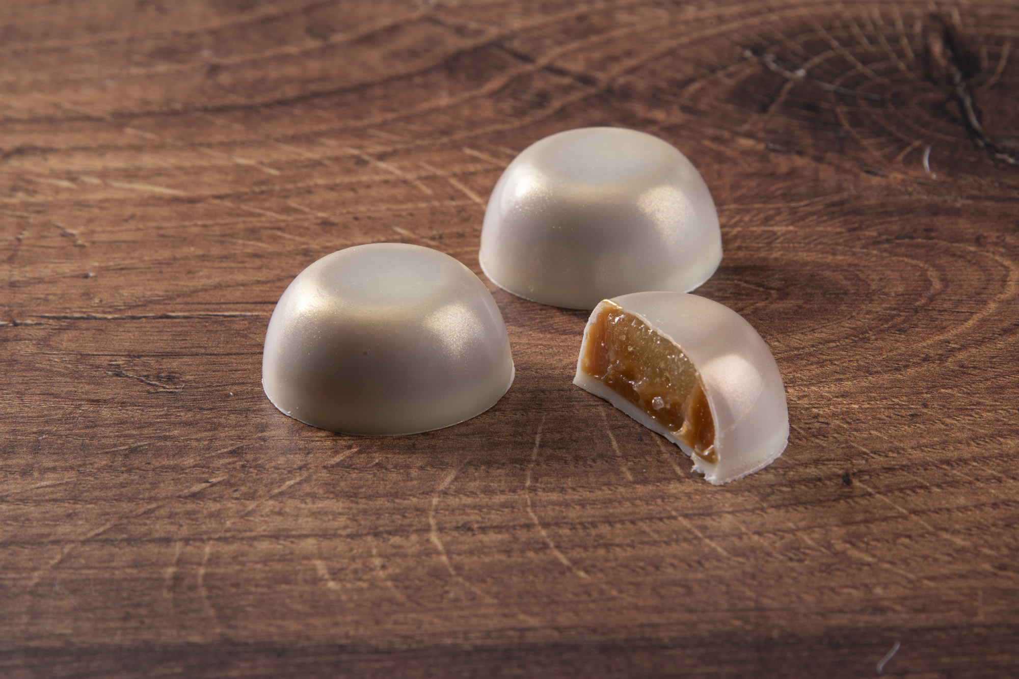 4. Once the caramel has firmed up, cap the chocolates with Callebaut W2 White Chocolate.